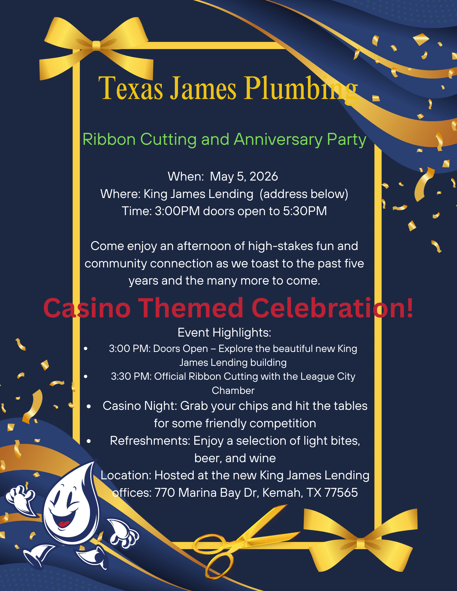 DESCRIPTION:Texas James Plumbing is celebrating 5 years in business!! Come tour the new King James Lending building\, ribbon cutting at 3:30 and then enjoy the casino night!!