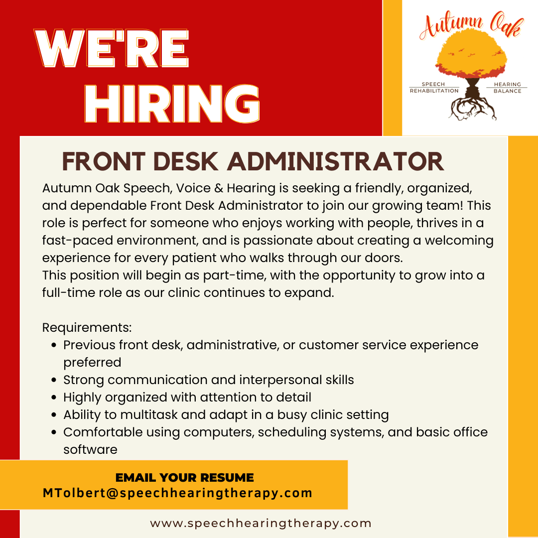Autumn Oak Speech, Voice & Hearing is seeking a friendly, organized, and dependable Front Desk Administrator to join our growing team! This role is perfect for someone who enjoys working with people, thrives in a fast-paced environment, and is passionate about creating a welcoming experience for every patient who walks through our doors.
